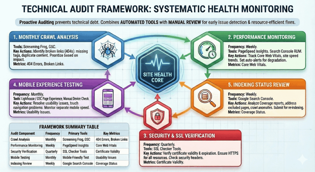Effective audit frameworks combine automated tools with manual review processes to capture both obvious issues and subtle problems that impact site performance.